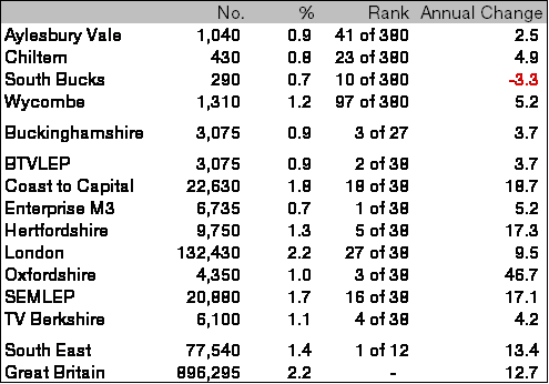 While the claimant count rate remained unchanged at 0.9 per cent of working age residents, Buckinghamshire’s ranking improved to the 3rd lowest rate among county council areas and 2nd lowest among LEPs.