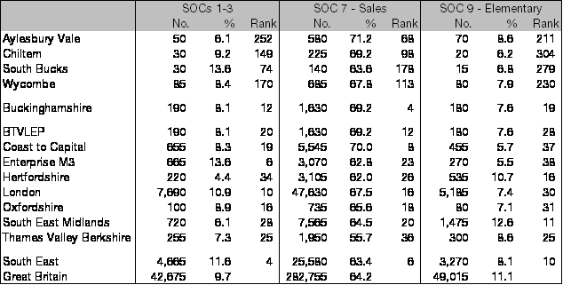 Job Seekers’ Allowance (JSA) claimants looking for work in sales occupations now make up 69.2 per cent of Buckinghamshire’s total, having accounted for just 24.4 per cent in April 2012 and 47.9 per cent in April 2016. There were 1,630 Buckinghamshire residents looking for work in sales occupations in April, 2.7 for every job posted. In contrast there were only 190 resident JSA claimants looking for work in managerial, professional and technical occupations compared to 4,287 job openings, 22.6 job openings per claimant.