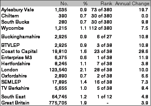At 0.9 per cent of working age residents, Buckinghamshire’s claimant count remains less than half the national level, ranking 3rd lowest among the 38 Local Enterprise Partnerships and 6th lowest among the 27 county council areas. Over the last year Buckinghamshire’s claimant count has risen by 10.8 per cent, the lowest rate of annual growth recorded since November 2016, as shown in chart 5, but still more than double both the national and regional rises (3.9 and 4.8 per cent respectively).