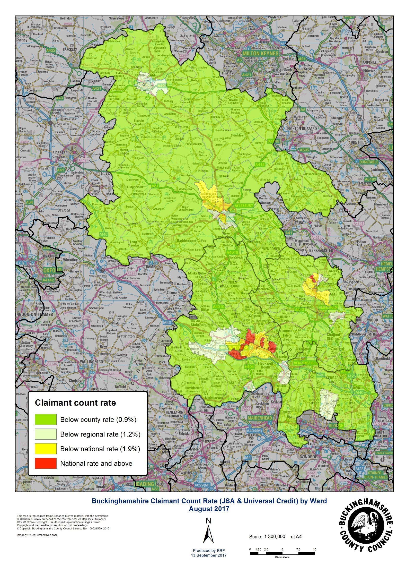 Five of the six wards in Buckinghamshire where the claimant count is not below the national rate are in High Wycombe. However, the town has seen the number of claimants rise by 8.4 per cent over the last year, compared to 12.0 per cent for the rest of the county. Overall, the claimant count has risen by 10.1 per cent in Buckinghamshire’s urban areas in the last year but by more than a third, to 600, in rural areas. More than a fifth of Buckinghamshire’s claimants now live in rural areas, up from 17.3 per cent in August last year.