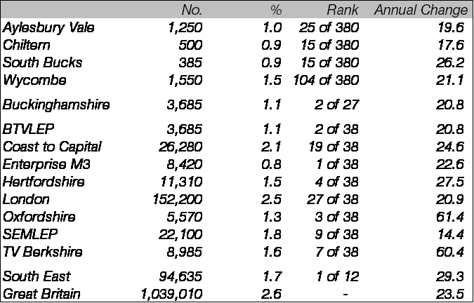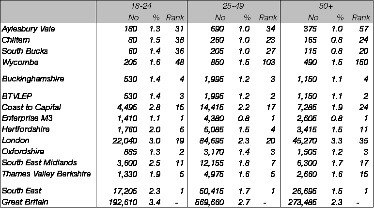 At 1.1 per cent of working age residents, Buckinghamshire has the 2nd lowest claimant count rate among both the 27 county council areas and the 38 Local Enterprise Partnerships (LEPs). Buckinghamshire’s claimant counts range from 0.9 per cent in Chiltern and South Bucks to 1.5 per cent in Wycombe. By parliamentary constituency, the range is wider, from 0.6 per cent in Buckingham, the 2nd lowest of the UK’s 650 constituencies to 1.8 per cent in Wycombe (209th). Beaconsfield and Chesham and Amersham rank 19th at 0.9 while Aylesbury ranks 91st (1.3)