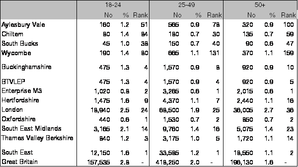 At 0.9 per cent of working age residents Buckinghamshire’s claimant remains less than half the national level, ranking 3rd lowest among the 38 Local Enterprise Partnerships and 6th lowest among the 27 county council areas. Over the last year Buckinghamshire’s claimant count has risen by 13.9 per cent, more than double both the national and regional rises (4.6 and 5.7 per cent respectively).