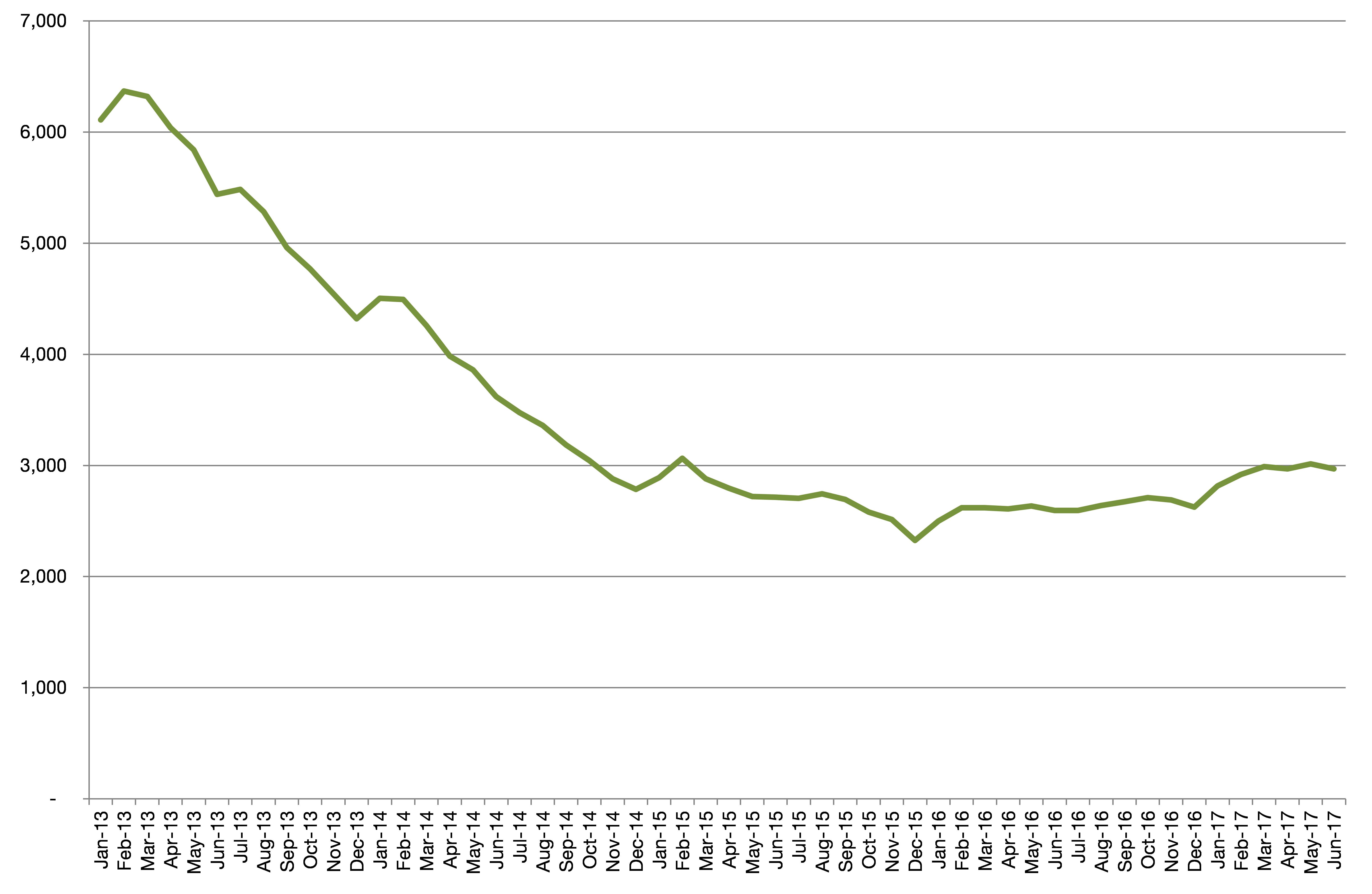 Chart 3: Chiltern’s claimant count over time, to June 2017