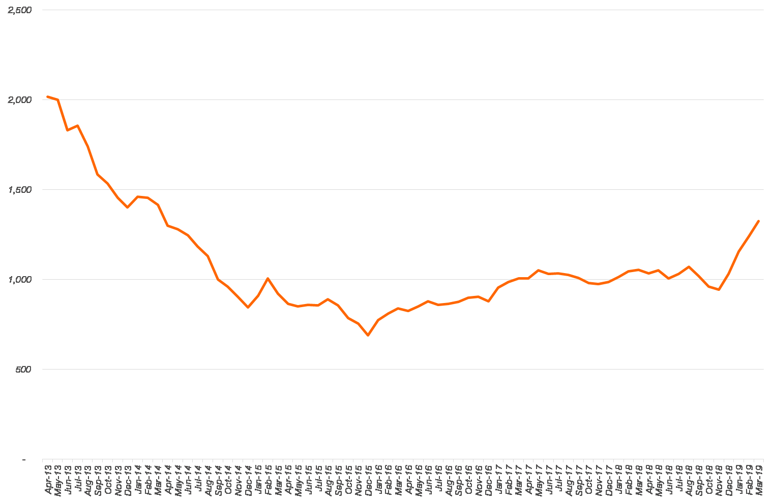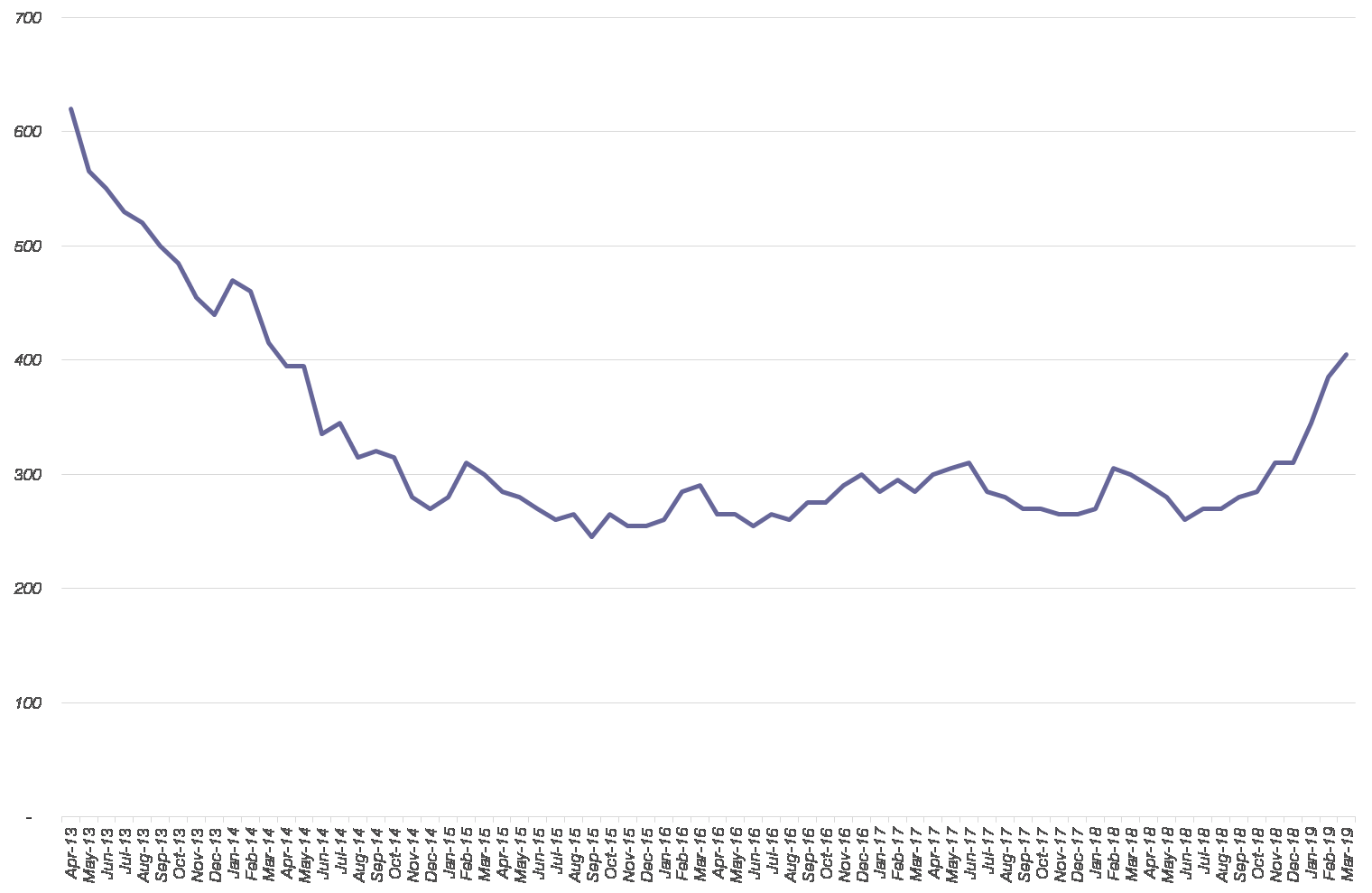 Chart 4: South Bucks’ claimant count over time, to March 2019