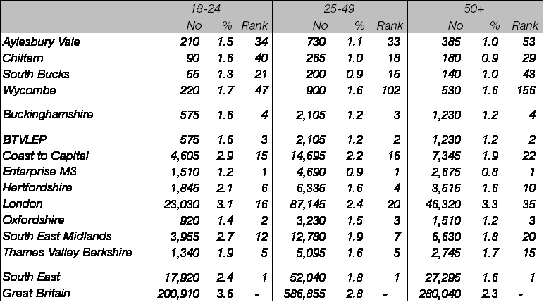 At 1.2 per cent of working age residents, Buckinghamshire has the 3rd lowest claimant count rate among the 26 county council areas, ranking 2nd among the 38 Local Enterprise Partnerships (LEPs). Claimant count rates range from 1.0 per cent in Chiltern and South Bucks to 1.6 per cent in Wycombe. There are four wards in Buckinghamshire where the claimant count rate is above the national level; three in High Wycombe and one in Chesham (see the map at the end).