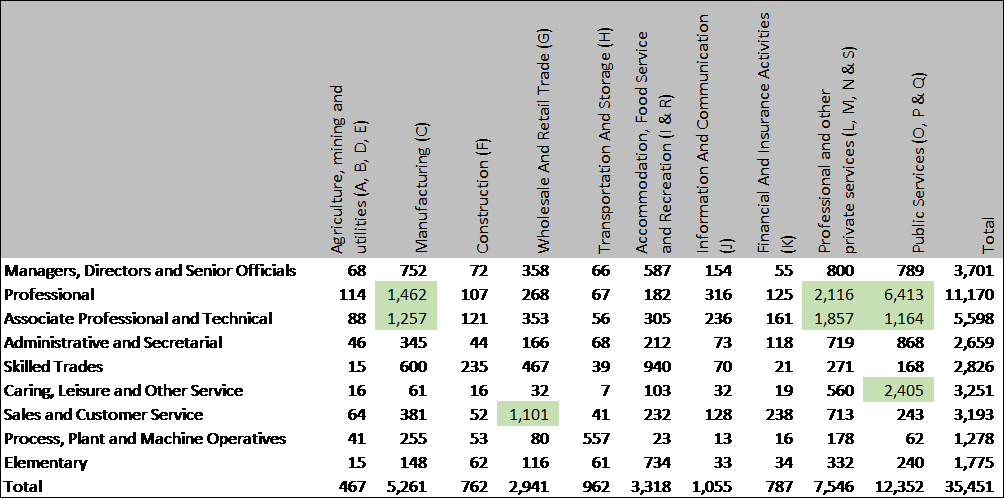 Over the last year, the public sector has been the industry with the most advertised openings, accounting for more than a third of openings where both industry and occupation are known. Jobs for professionals working in the public sector (6,413 openings) were the most commonly advertised openings in Buckinghamshire in the year to March 2019 ahead of caring, leisure and other service roles also in the public sector (2,405), professionals and associate professionals in professional and other private services (2,116 and 1,857 respectively), and professionals and associate professionals in manufacturing (1,462 and 1,257). The full results are presented in Chart 7.