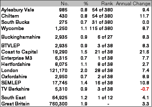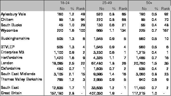 Despite this rise, at 0.9 per cent of working age residents, it remains less than half the national level, ranking 3rd lowest among the 38 Local Enterprise Partnerships and 6th lowest among the 27 county council areas. The claimant count continues to rise faster in Buckinghamshire than across the country as a whole.