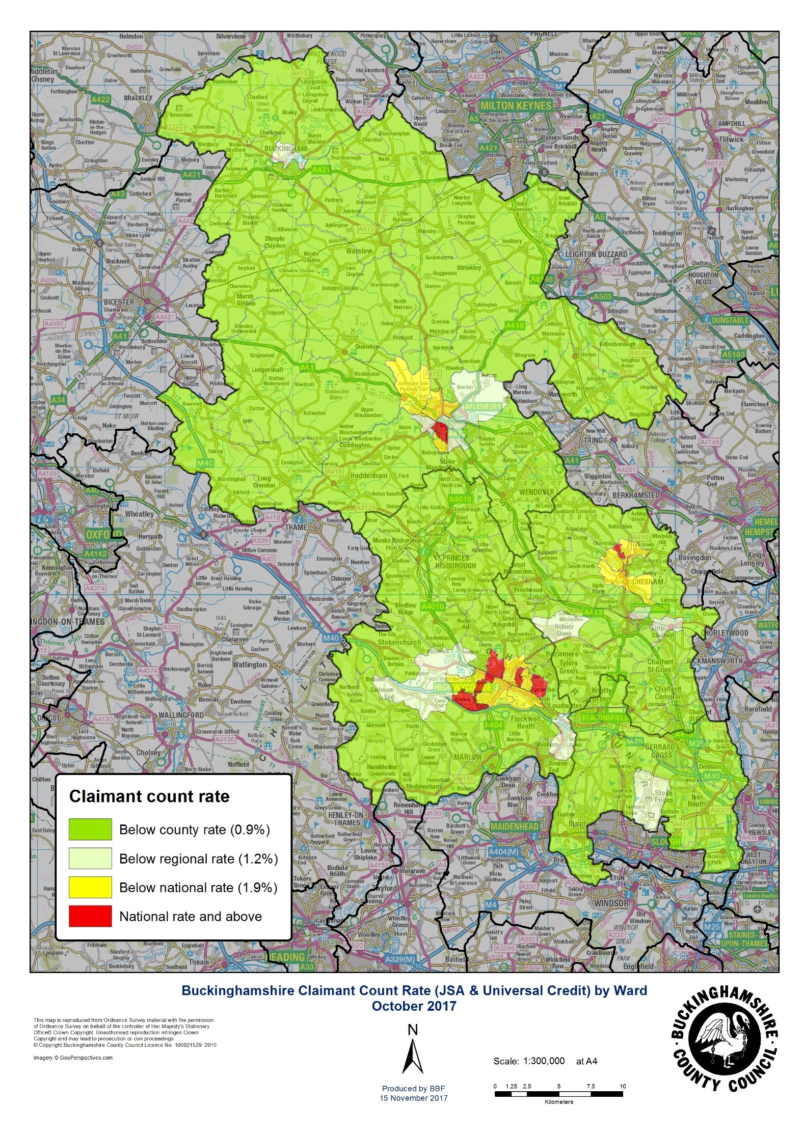 There are now seven wards in Buckinghamshire where the claimant count rate is above the national rate, five in High Wycombe and one each in both Aylesbury and Chesham. Across Buckinghamshire, the claimant count rate in rural areas is half the urban rate.