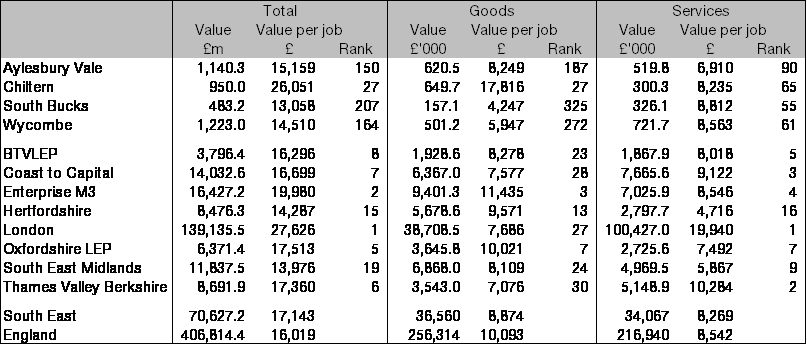At £16,296, Buckinghamshire ranked 8th among the 38 Local Enterprise Partnerships for value of export per job. Although Buckinghamshire’s goods exports were worth more than service exports and accordingly had a higher value per local job, Buckinghamshire ranked 5th among LEPs for service export value per job but only 23rd for goods export value per job.