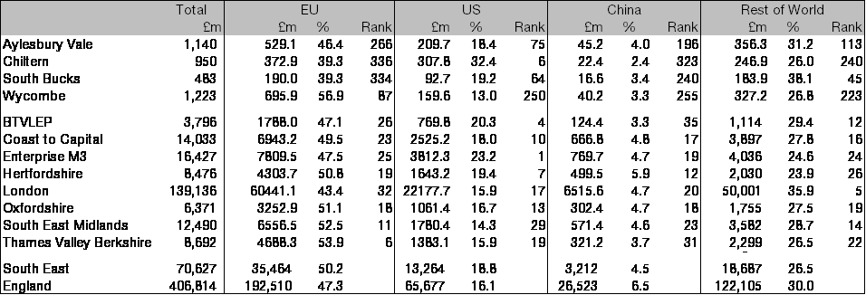 The EU, US and China accounted for 70.6 per cent of Buckinghamshire’s exports in 2015, with goods and services worth £1.1bn being exported to the rest of the world. Buckinghamshire had the 12th highest share of its goods and services exports going to the rest of the world among LEPs, led by South Bucks where 38.1 per cent were exported to those markets, the 45th highest share among local authorities.