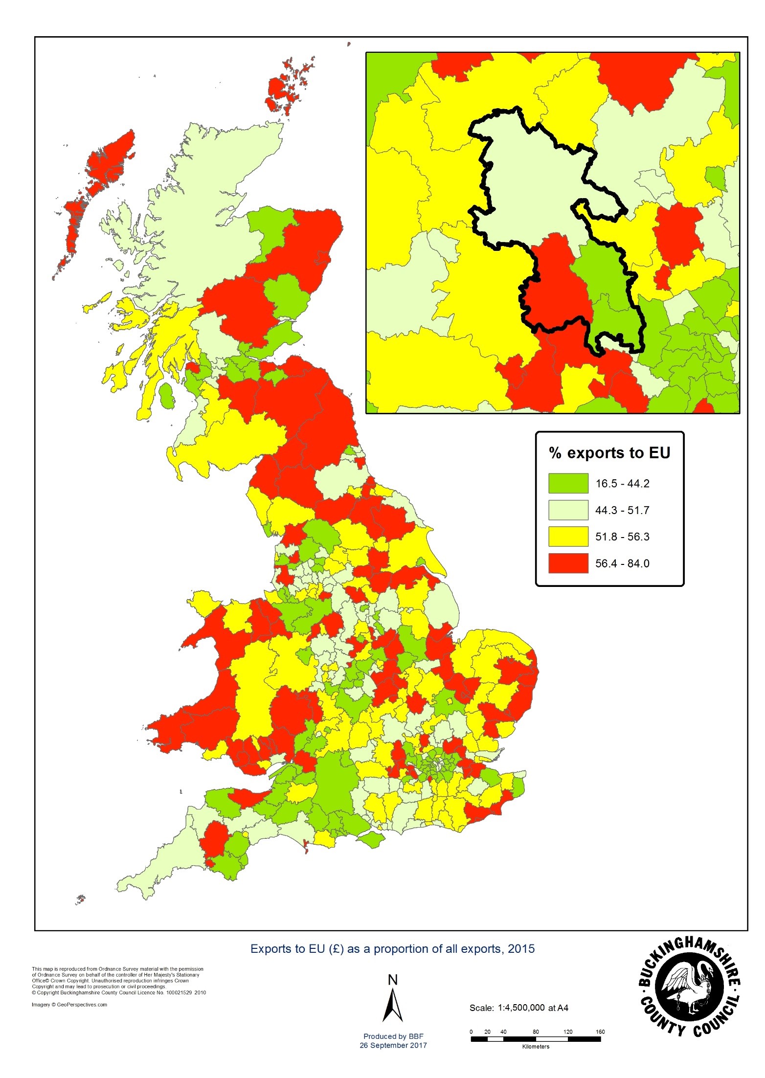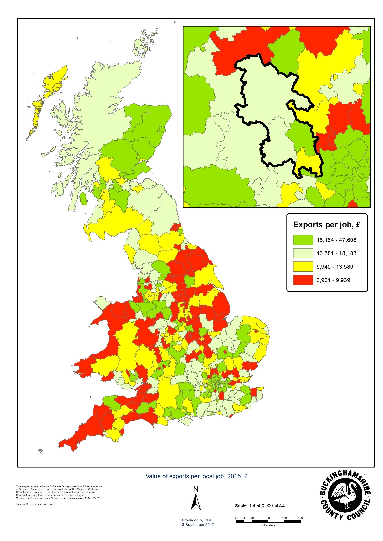 Buckinghamshire’s exports were worth £3.8bn in 2015, split evenly between goods and services.