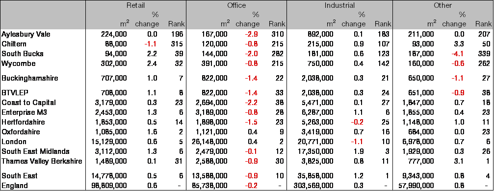 Between 2008 and 2016, Buckinghamshire’s business floorspace increased by 11,000m2, or 0.3 per cent, the 21st highest rate of increase among the 38 (LEPs) but well above the 0.3 per cent fall recorded across England. Over that period Buckinghamshire added 67,000m2 of retail space and 64,000m2 of other floorspace, increases of 10.5 and 10.9 per cent respectively, ranking 1st and 4th among LEPs. Conversely, office floorspace fell by 4.3 per cent (37,000m2) the 2nd weakest performance of any LEP, while industrial floorspace fell by 3.8 per cent (80,000m2) to rank 21st among LEPs.