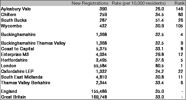South Bucks was the only Buckinghamshire district to better England’s rate with 51.4 new registrations for every 10,000 residents, the 26th highest rate of all 380 local authorities in Great Britain and 9th highest outside London, whilst at 34.5 Chiltern’s rate was above Great Britain’s to rank 83rd. Wycombe (432) and Aylesbury Vale (390) saw the highest number of registrations in Buckinghamshire but both with registration rates that rank outside the national top 100.