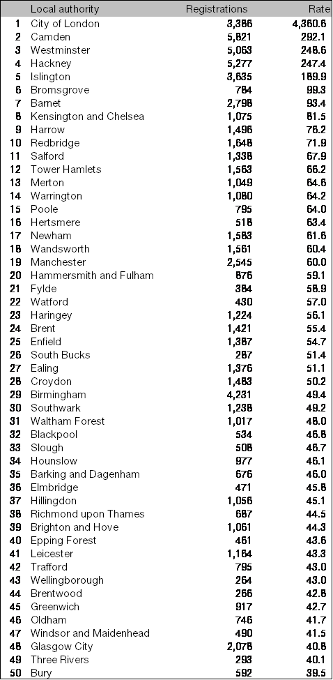London’s share of England’s new registrations rose to 35.7 per cent in the quarter, with London Boroughs accounting for nine of the top ten local authorities by registration rate and 14 of the top 20 with all 33 of London’s local authorities bettering England’s rate of new business registration.