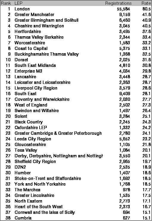 Table 3: New business registrations for every 10,000 residents (16+) by LEP, Q1 2017