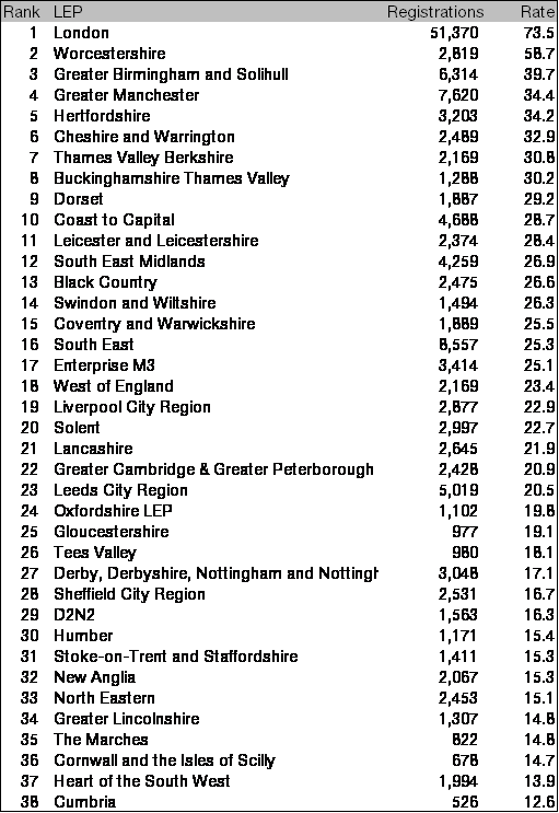 Table 3: New business registrations for every 10,000 residents (16+) by LEP, Q2 2017