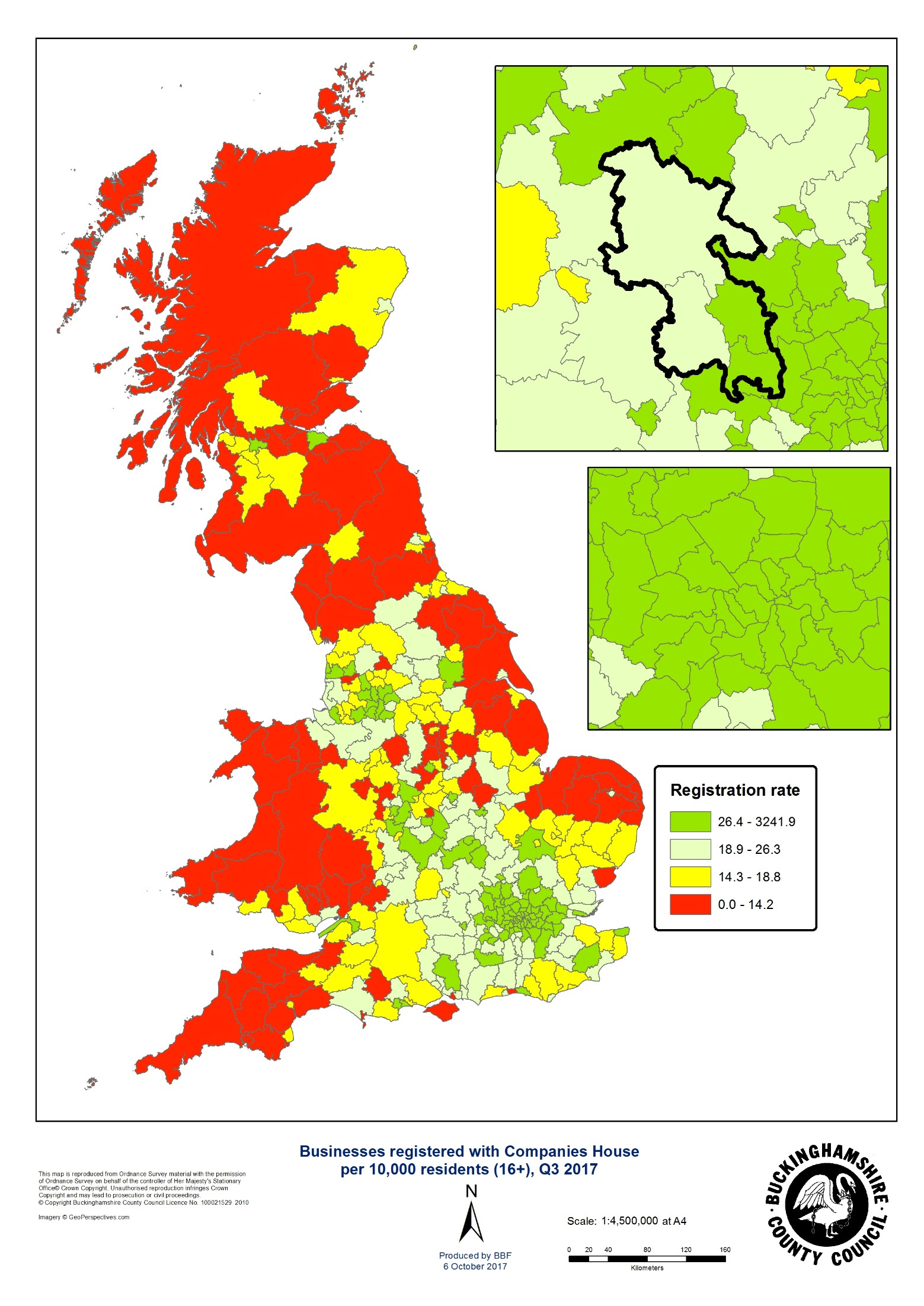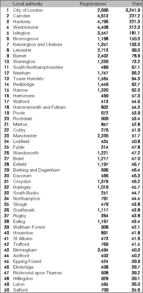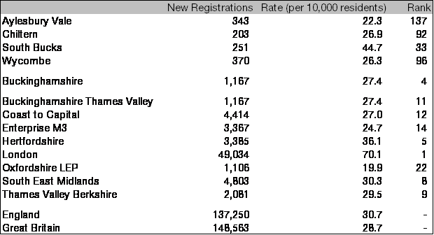 South Bucks recorded Buckinghamshire’s highest new registration rate at 44.7 registrations per resident aged 16 or over, to rank 33rd among the 380 local authority districts in Great Britain and 14th highest outside London. No other Buckinghamshire district bettered the national rate. Chiltern ranked 92nd with a registration rate of 26.9 ahead of Wycombe (26.3, 96th) and Aylesbury Vale (22.3, 137th).