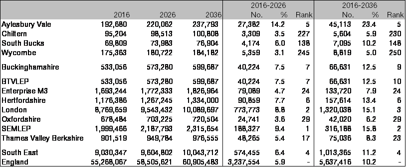 Buckinghamshire’s rate of growth will be above the national and regional rates, ranking 7th highest among both the 27 county council areas and the 38 Local Enterprise Partnerships (LEPs). Aylesbury Vale is projected to account for 68.1 per cent of Buckinghamshire’s growth to 2026, and 67.1 per cent from 2026 to 2036.