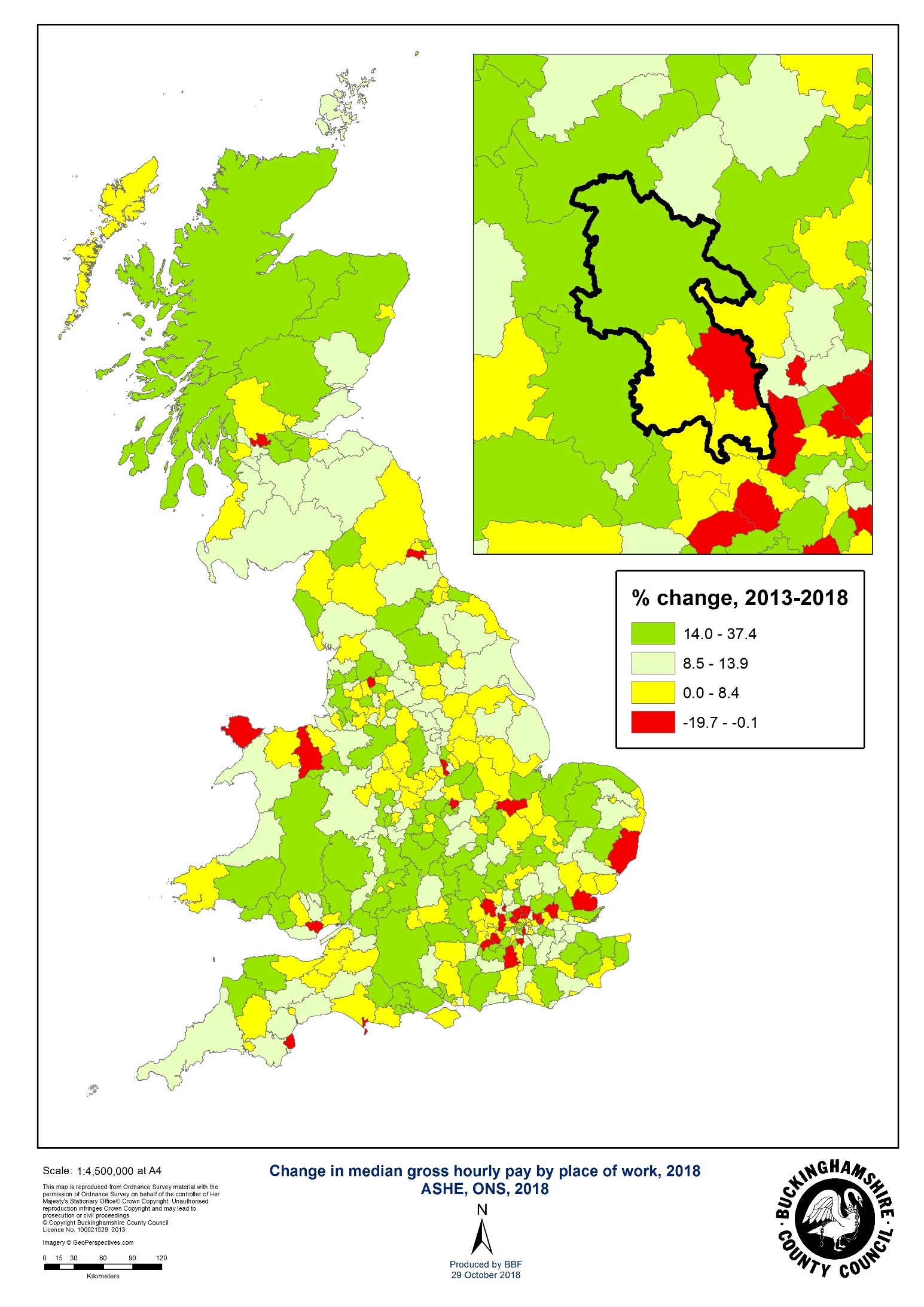 At £31,828, the High Wycombe and Aylesbury travel to work area (TTWA) has the 14th highest workplace-based gross median full-time earnings of all 151 TTWAs in England, ahead of the Milton Keynes TTWA which includes Buckingham and Winslow (£30,268, 19th) but behind the £32,597 recorded in the Slough and Heathrow TTWA (11th), which includes all of South Bucks except Beaconsfield and Gerrards Cross.