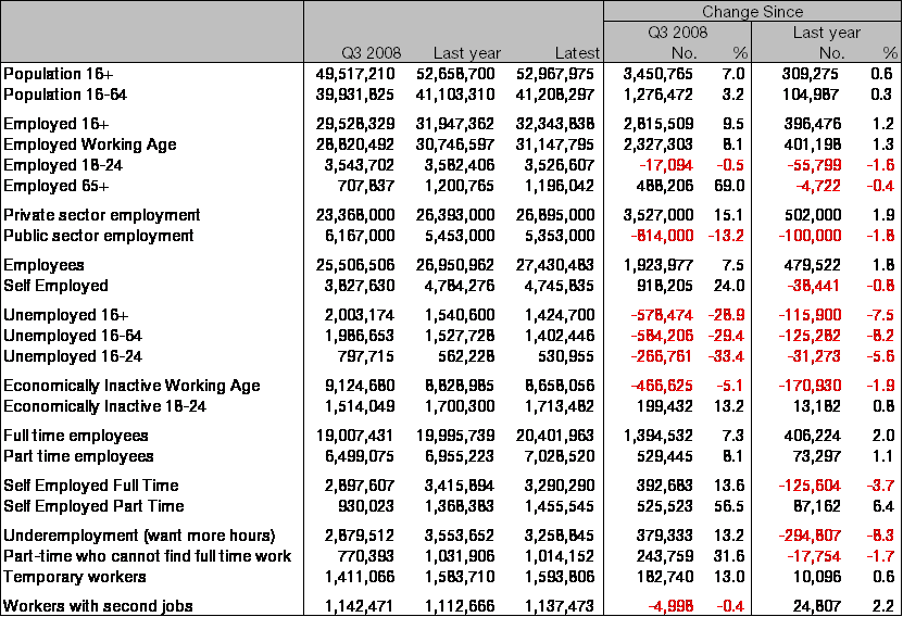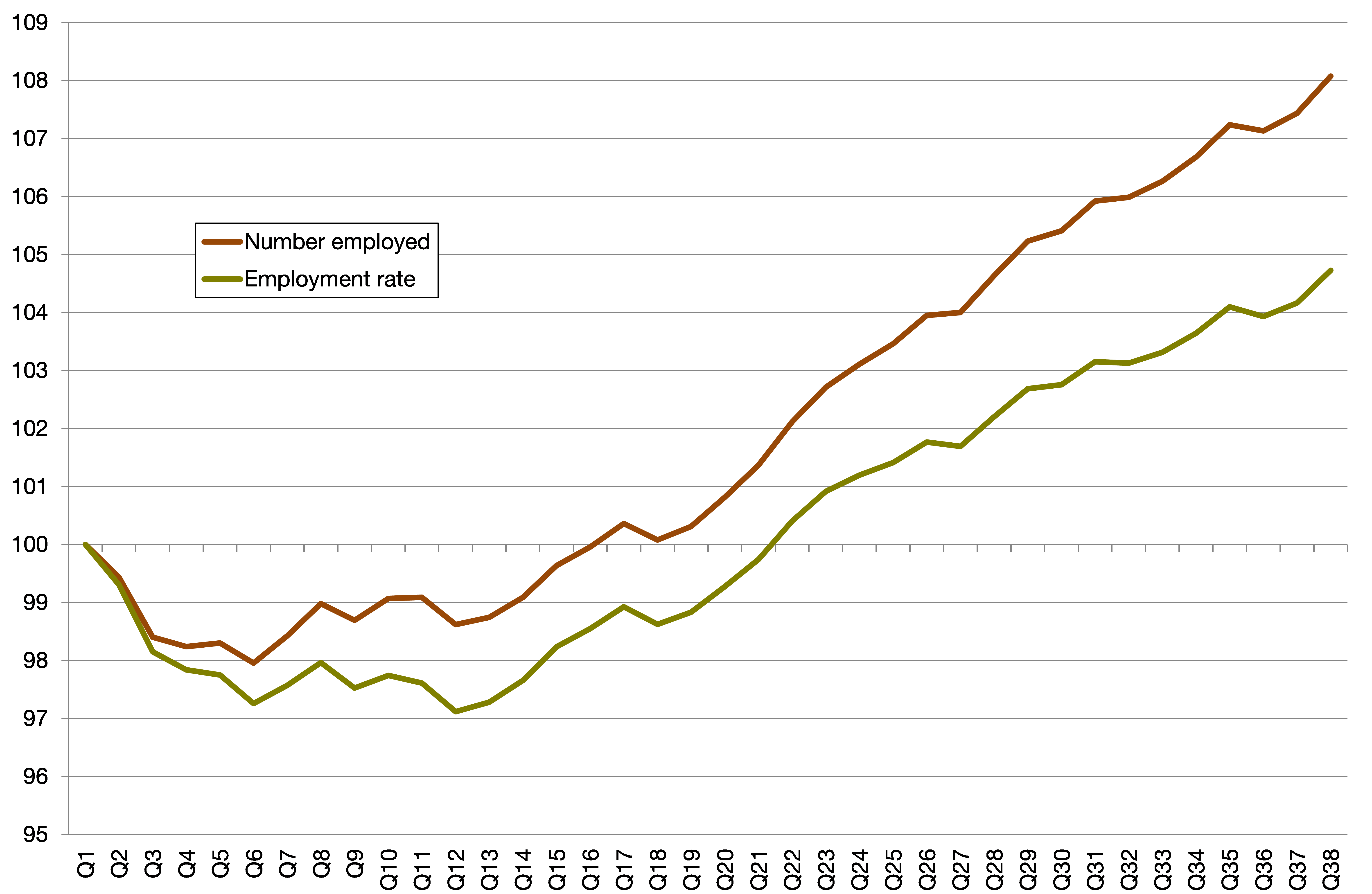 Chart 1: Working age employment and employment rate over time (Q3 2008 = 100)
