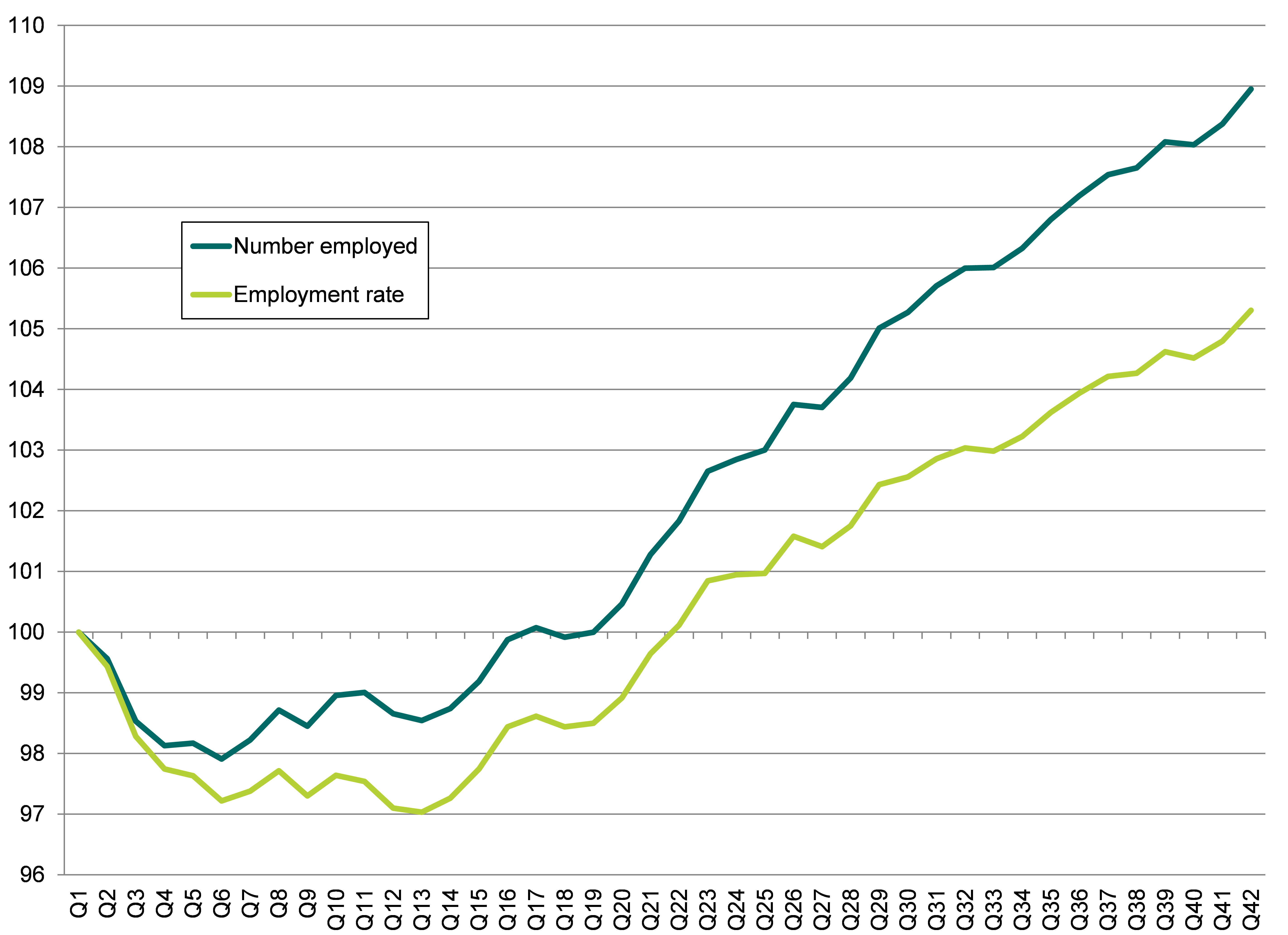 Chart 1: Working age employment and employment rate over time (Q3 2008 = 100)